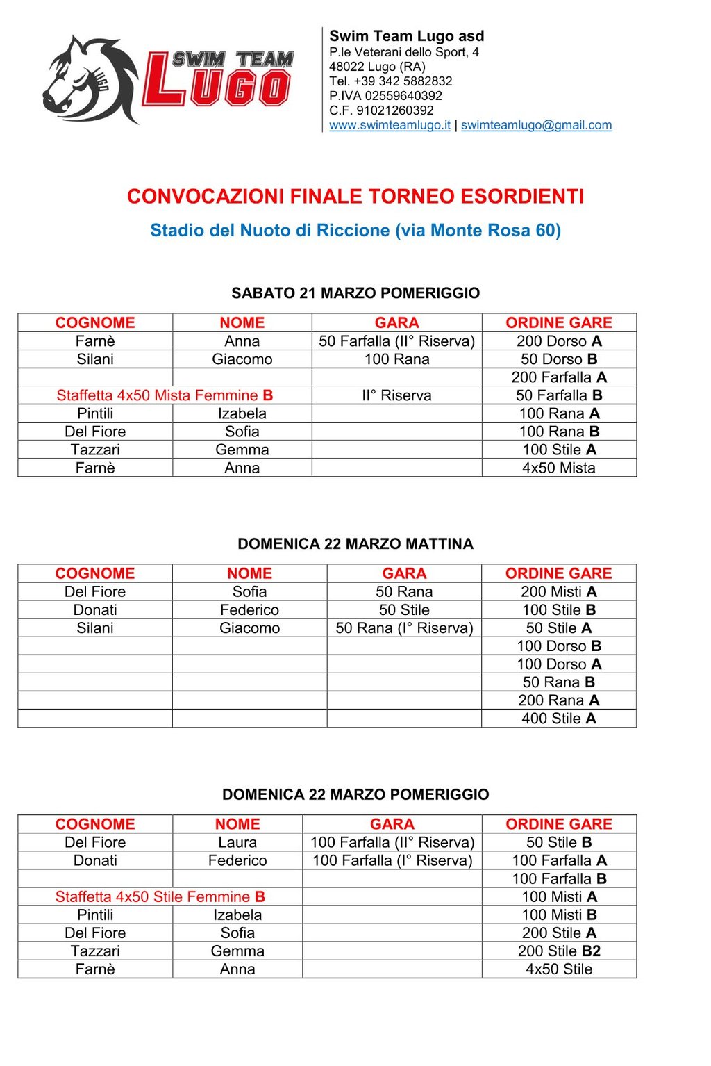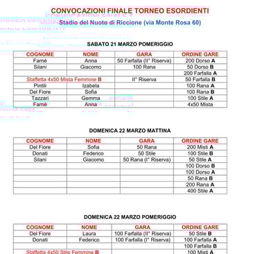 Il weekend del 21 e 22 aprile si terranno le finali del Torneo Esordienti presso lo Stadio del Nuoto a Riccione. Di seguito le convocazioni degli atleti: